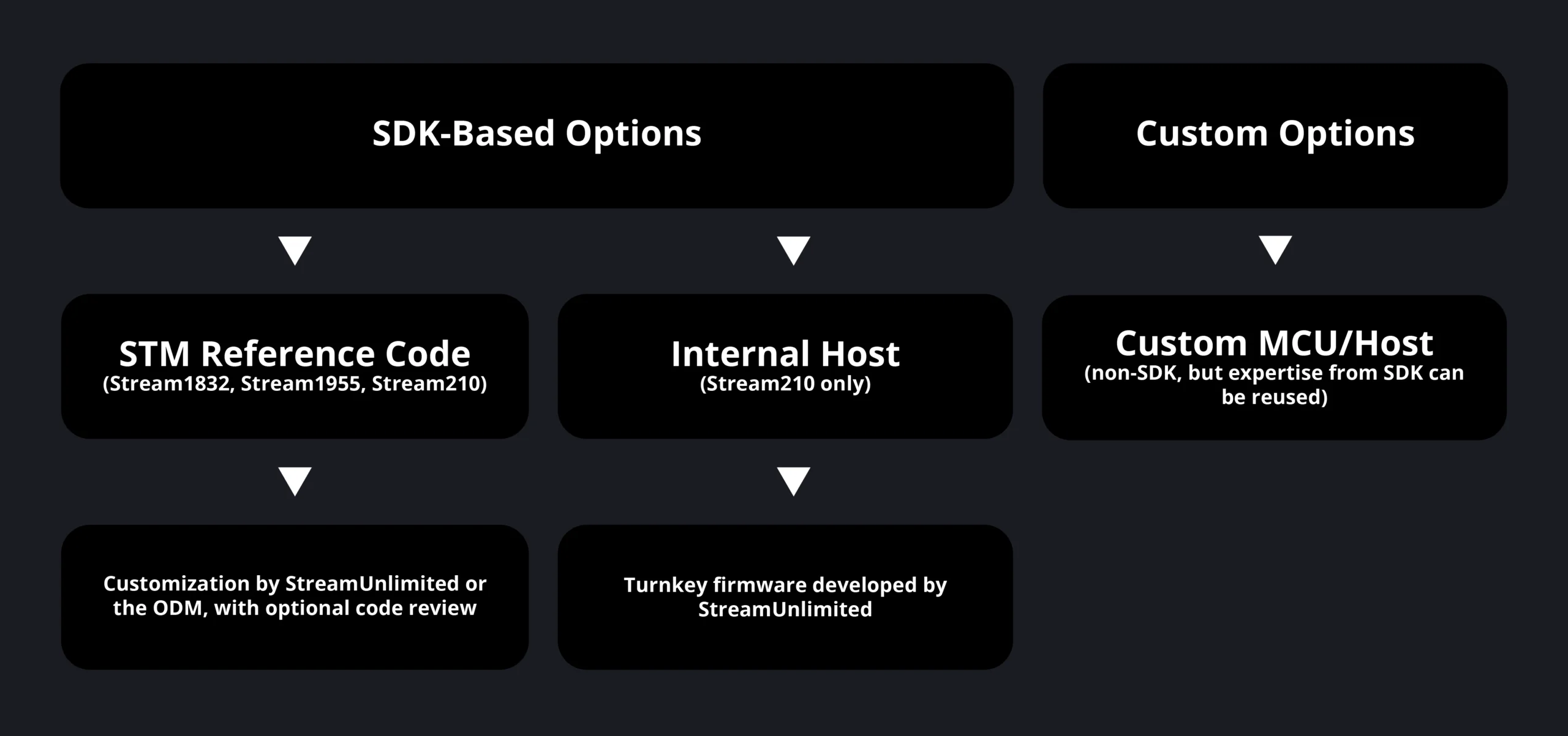 我们开发并维护一系列 STM 平台和定制 MCU 的固件,确保与 StreamUnlimited SDK 和解决方案的最佳集成。