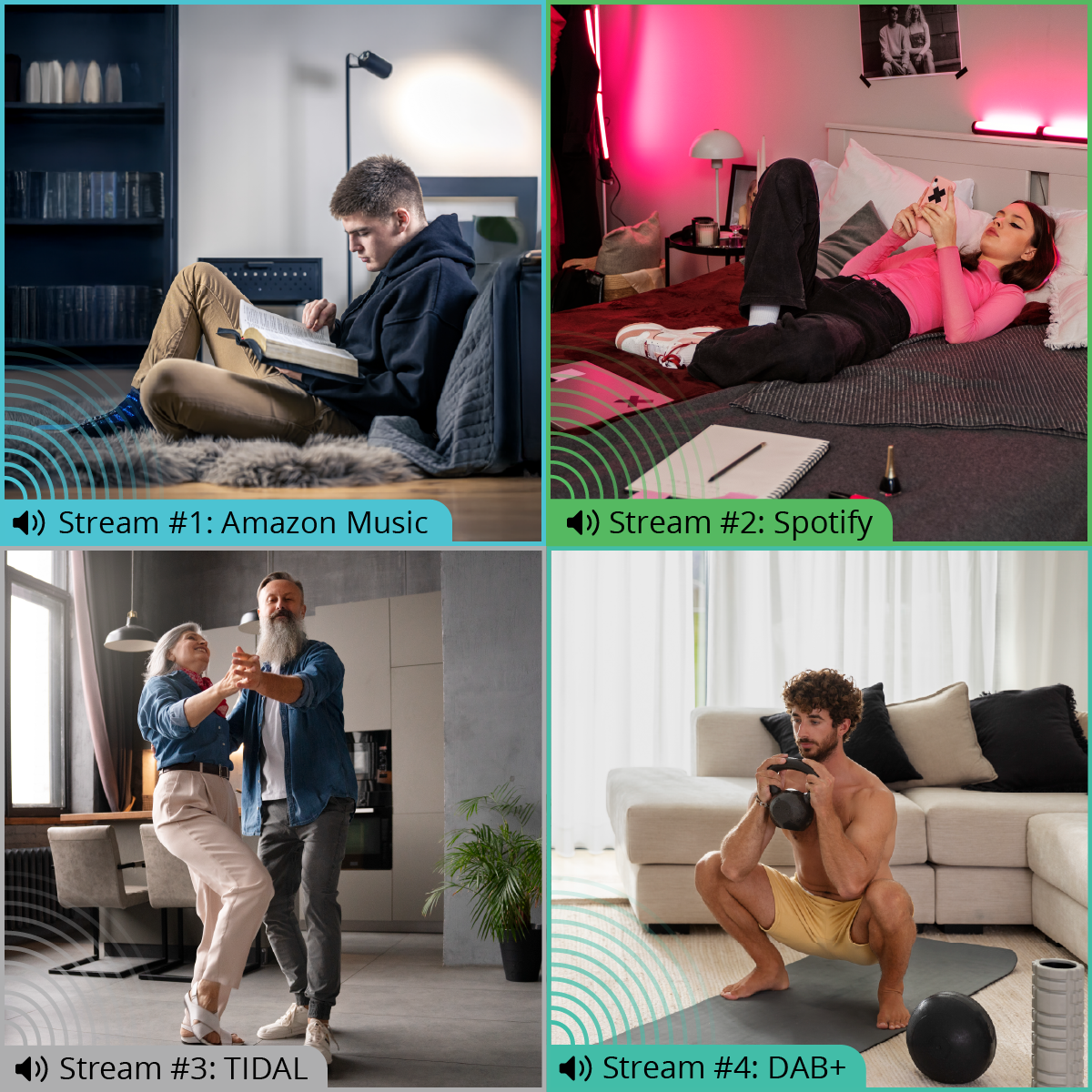 和 多流, ,您家中的每位听众都能享受专属的音乐体验——一个人用 Spotify 播放音乐,另一个人用 DAB+ 收听,而还有人在厨房里随着 TIDAL 的音乐翩翩起舞。所有音乐流都运行 独立且无缝地, ,无中断或延迟。.